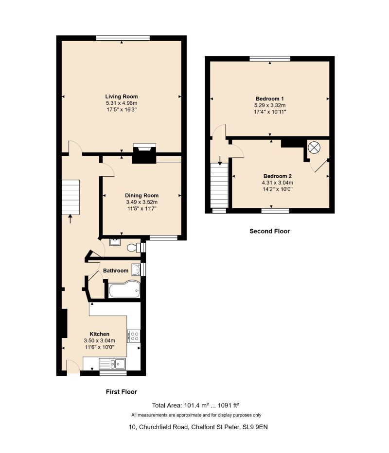 This first-floor maisonette is offered in good decorative condition and benefits from well-proportioned rooms. The first floor offers a kitchen, family bathroom with separate cloakroom, bedroom which is currently being used as a reception room, and living room. On the second floor are two further double bedrooms. The kitchen is fitted with units and a range of appliances, and the second floor bedrooms are both doubles in size, with views over Market Place and the entrance to the parking spaces.