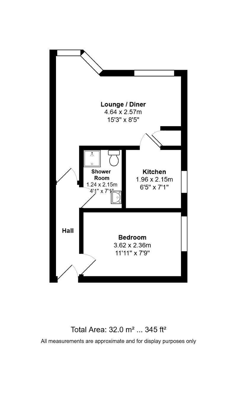 Communal entrance to front door, hallway, living room with two windows, kitchen with a window, bedroom and bathroom.