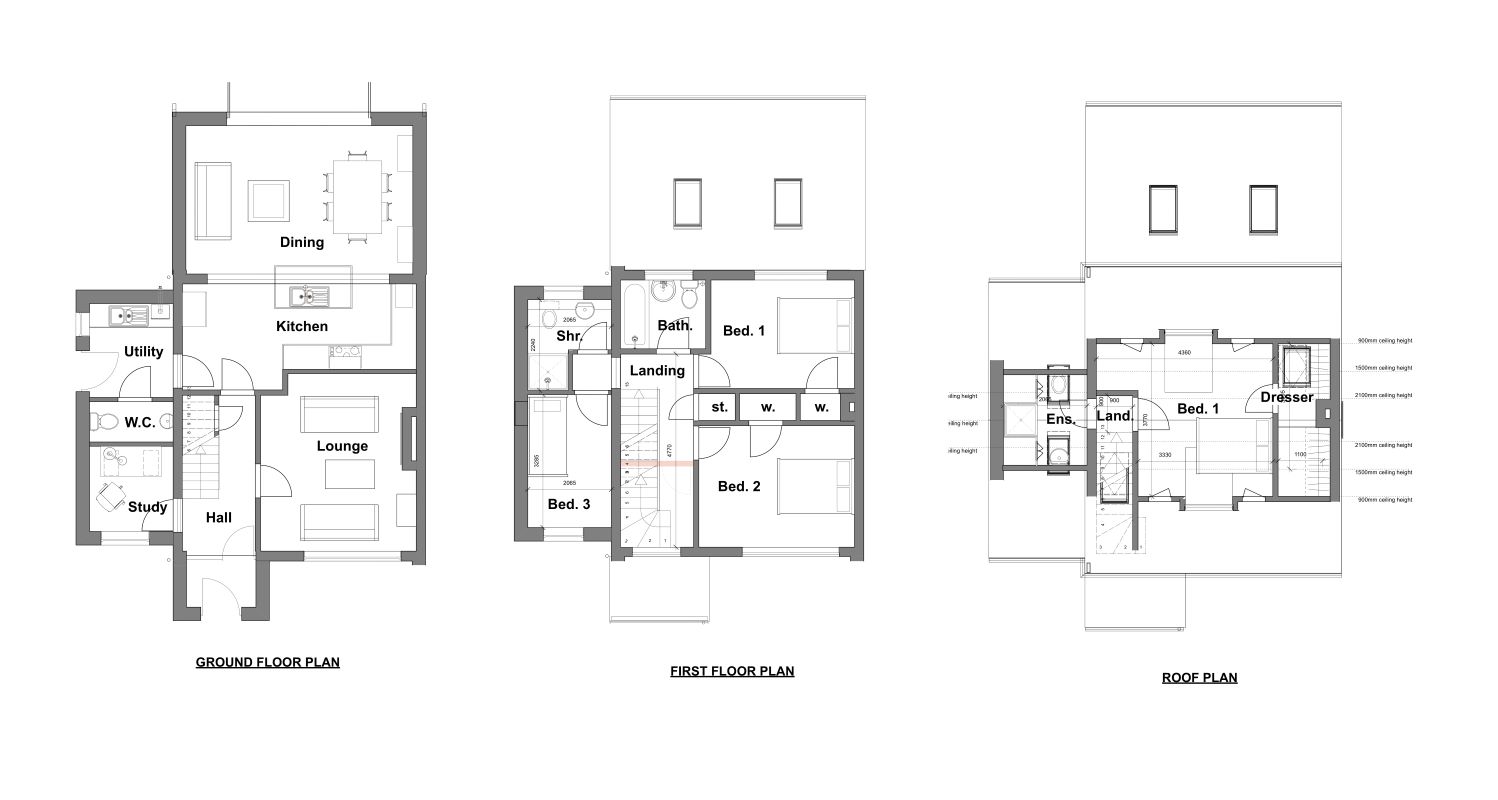 Proposed Ground Floor: Entrance hallway, living room, kitchen, study, W/C, utility room and dining room.