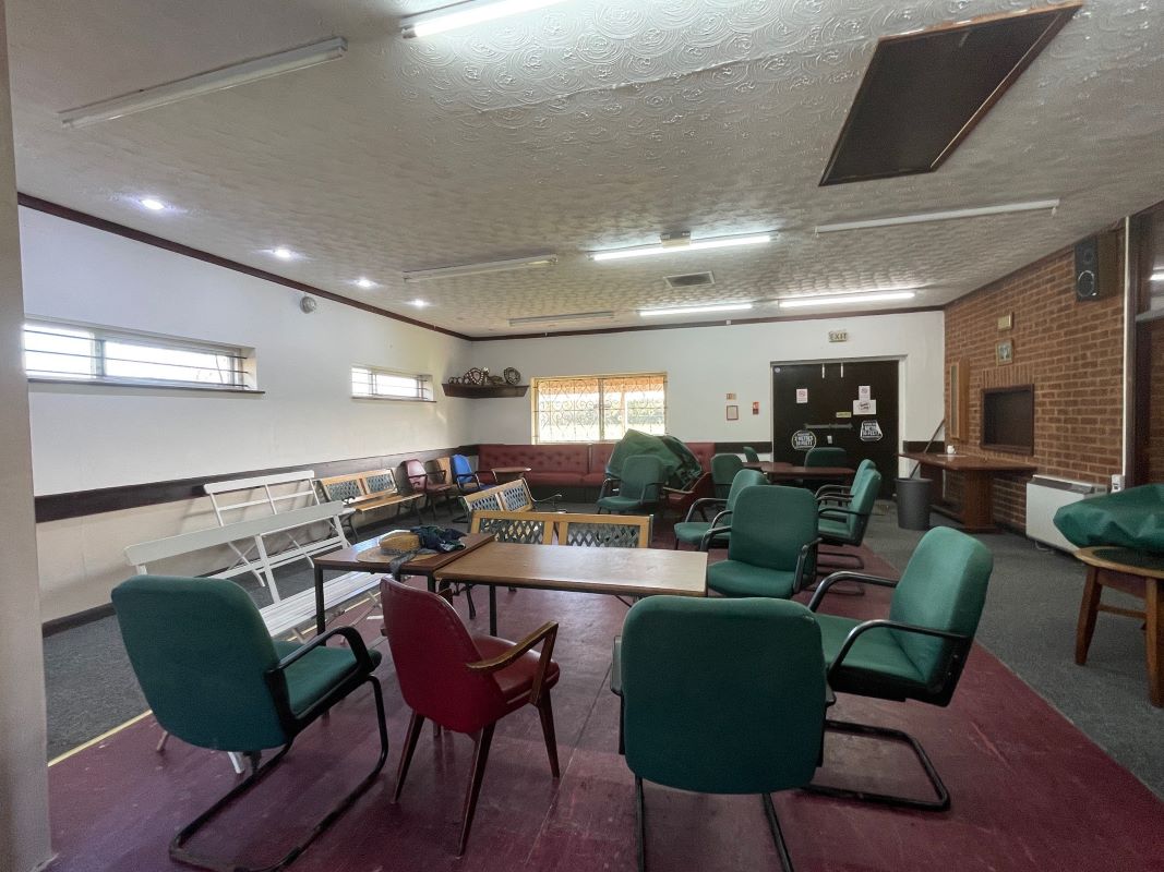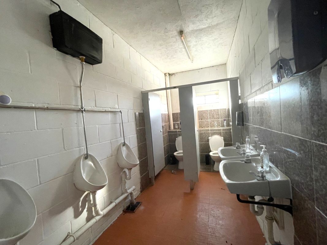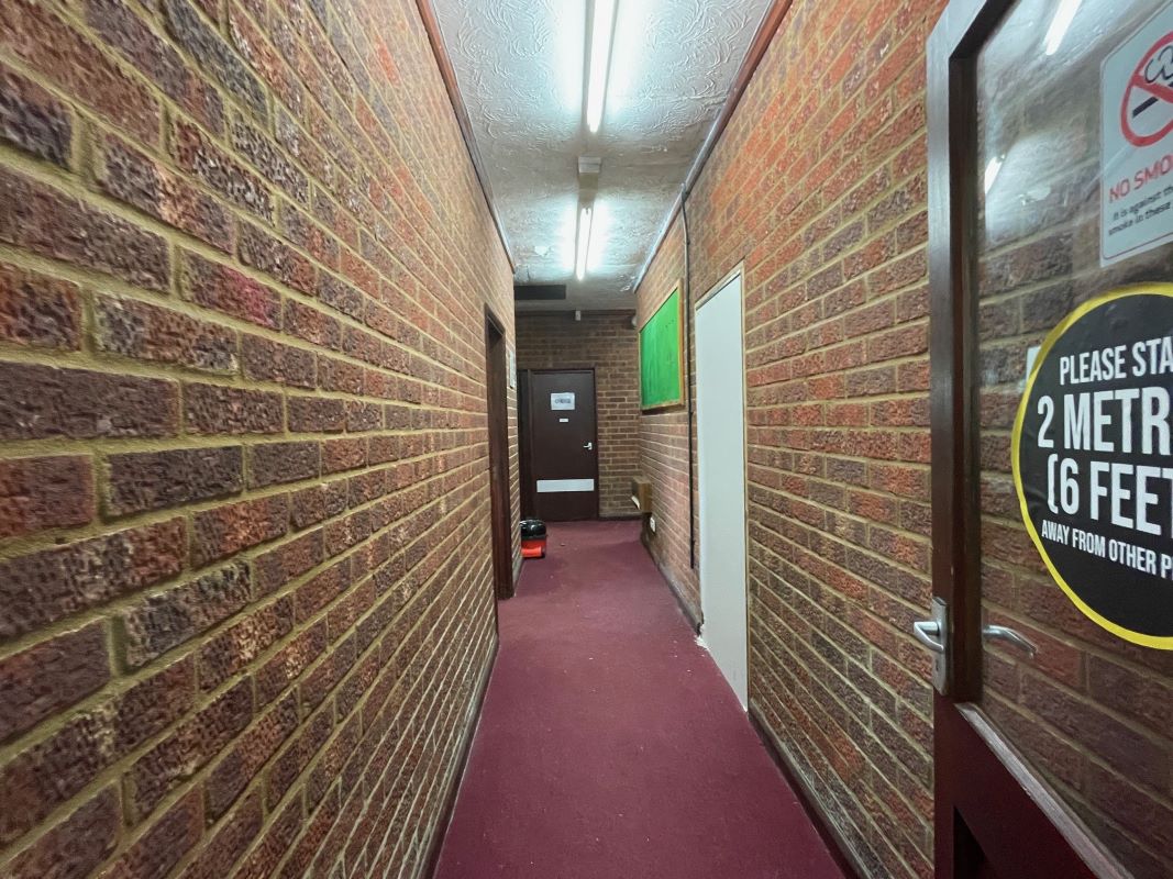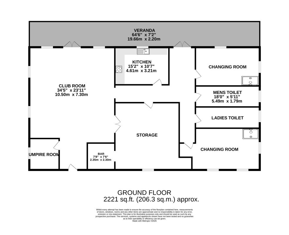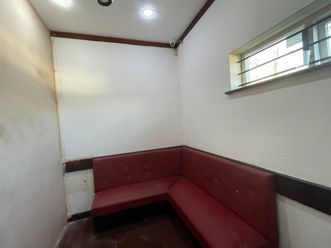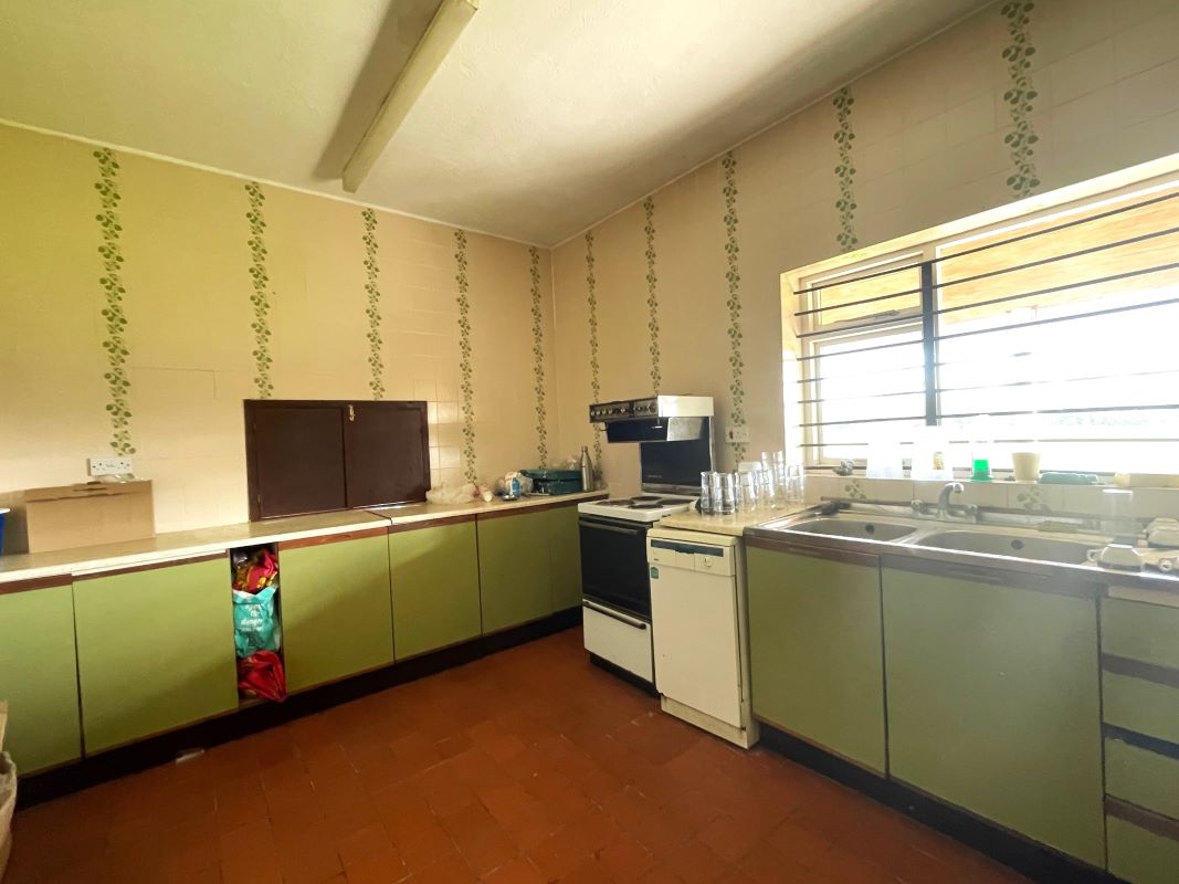 The brick‑built clubhouse, understood to date from the late 1960s, provides around 2,000 sq. ft. of accommodation, including a full‑length covered veranda, main club/bar area, kitchen, two dressing rooms, ladies’ and gents’ toilets, umpire room and a storage room. There is also a garage/store located by the car park. A driveway to the side of the main entrance provides shared access to the rear of the cricket ground.