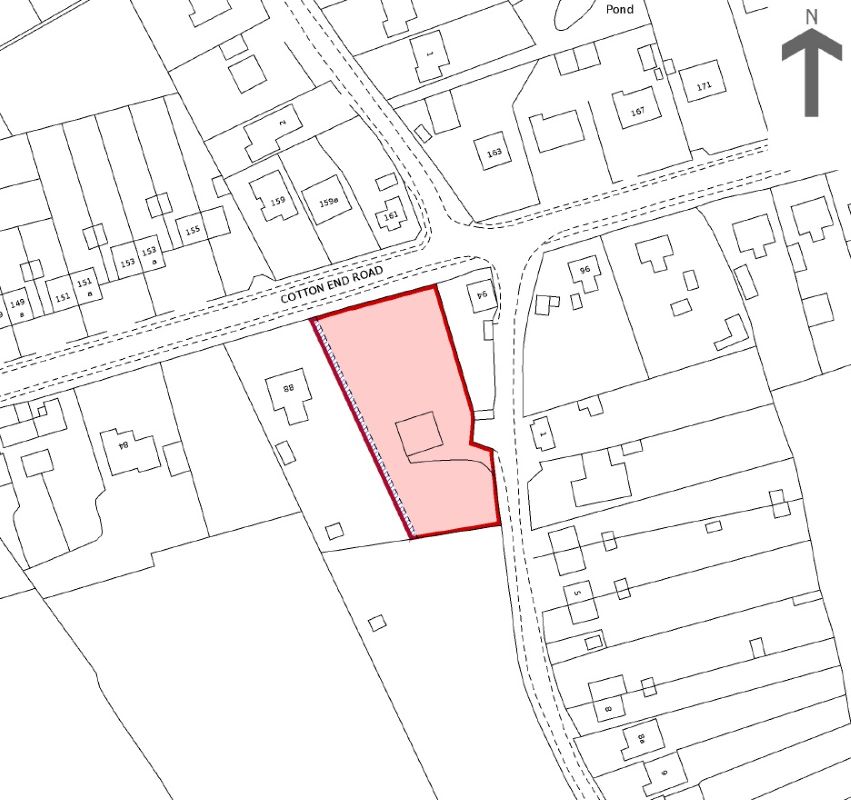 Set between numbers 88 and 94 Cotton End Road, this level parcel of land extends behind number 94 where there is a gated access to Ivy Lane. Quite centrally located is a substantial timber barn which is divided into three store rooms. To the roadside boundaries, there are well-established hedges, and within the plot, apart from the barn and overgrown scrub, there are several mature fruit trees, self-seeded saplings and trees, and at the southern edge of the plot is a seasonal pond. The plot measures almost half an acre, however, the position of the western boundary, which is adjacent to number 88, is not in the correct position. Details of this will be found within the legal pack.