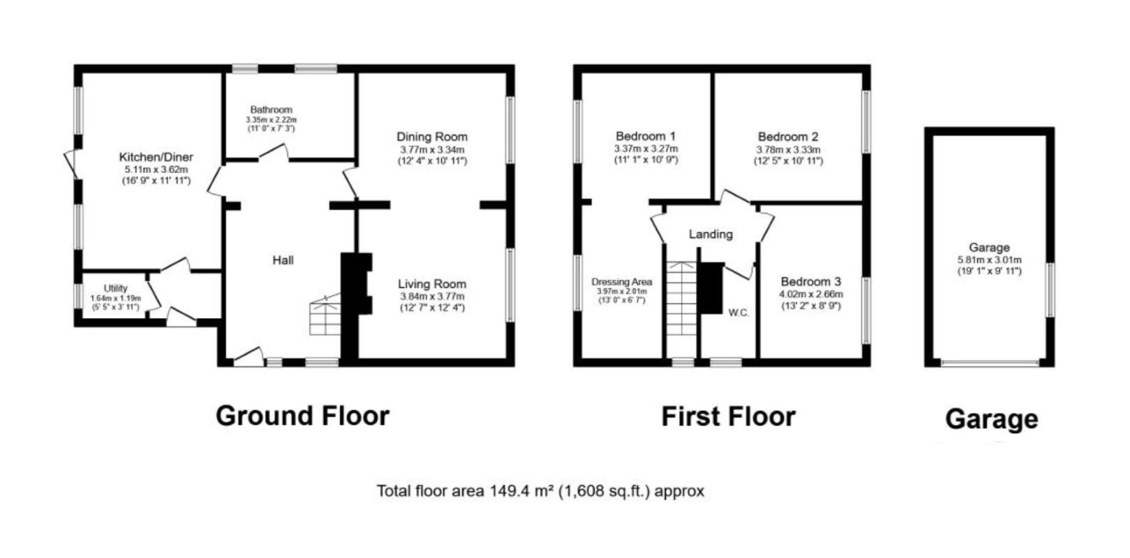 First Floor: Landing, W/C and three good size bedrooms with a fourth bedroom, which has been incorporated into the master bedroom as a dressing room.